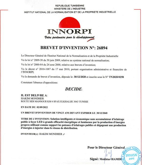 Notre innovation a été reconnue par un Brevet d'Invention sous le numéro 26894 déposé le 30/12/2020 et inscrit sous le numéro TN2020/0258 à l'INNORPI. Cette technologie unique repose sur une combinaison de solutions avancées permettant une meilleure gestion énergétique et une autonomie optimisée.