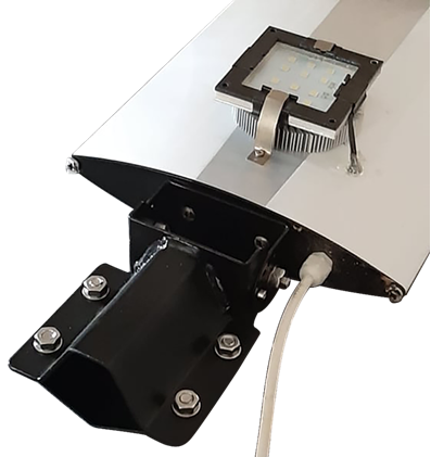 Le poteau de l'éclairage des municipalités, c'est le support de la solution constituée par la crosse, l'éolienne, le panneau photovoltaïque, la carte intelligente, le micro-onduleur et le module de transmission radio LoRa.