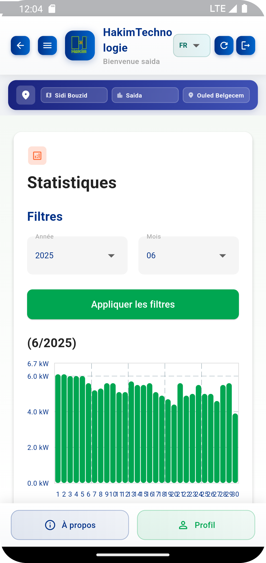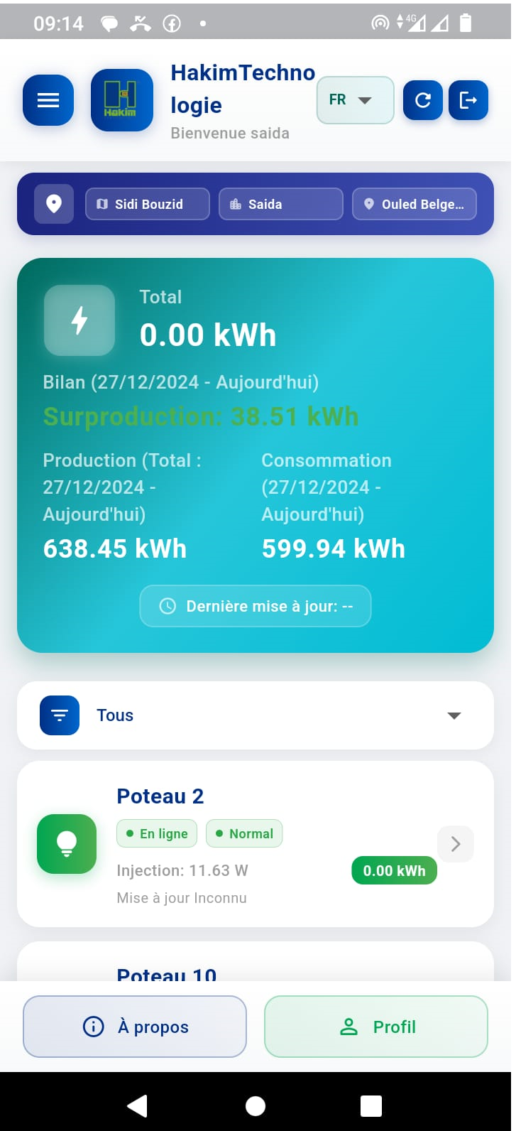 Notre solution est désormais disponible sur mobile pour permettre un suivi en temps réel et une gestion plus pratique de votre réseau d’éclairage public. Grâce à l’application Hakim Data, vous pouvez consulter à tout moment l’état des poteaux, la consommation énergétique, et recevoir des alertes instantanées.